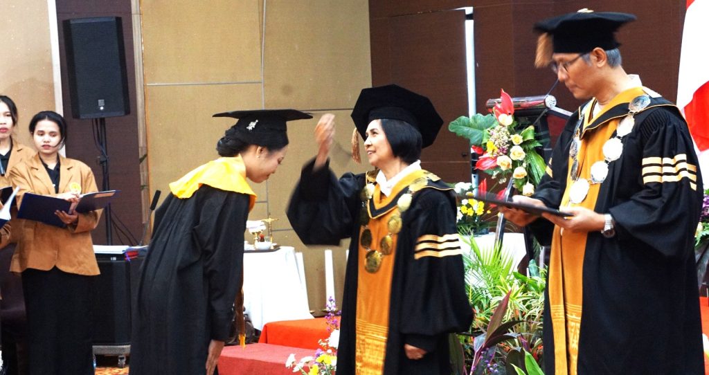 Ketua STPKat, Dr. Hartutik, M.Pd. memindahkan kuncer toga tanda wisuda mahasiswa. (dok Elwin)
