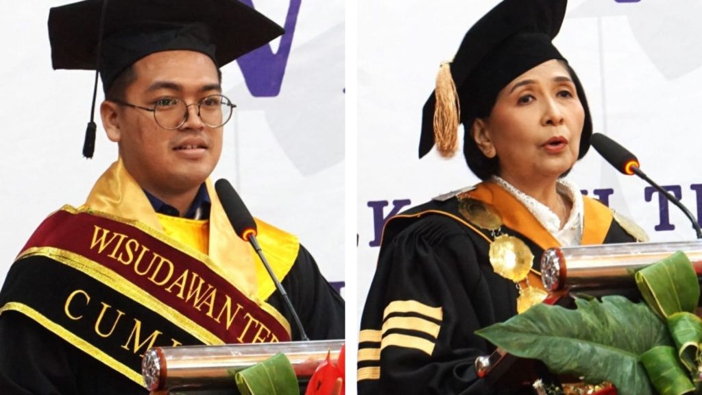 Wisudawan terbaik Stefanus Januar Siscautama, S.Pd. (kiri) dan Ketua STPKat, Dr. Hartutik, M.Pd. (kanan) saat memberikan sambutan. (dok Elwin)