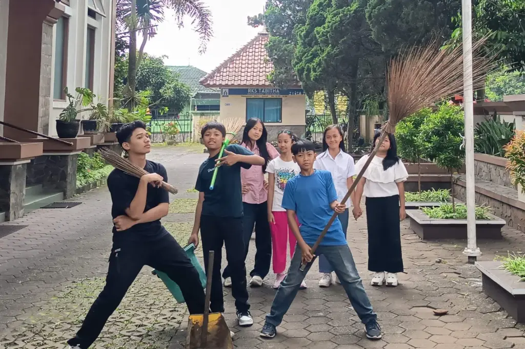 Anak-anak Misdinar yang sedang membersihkan lingkungan di sekitar Gereja