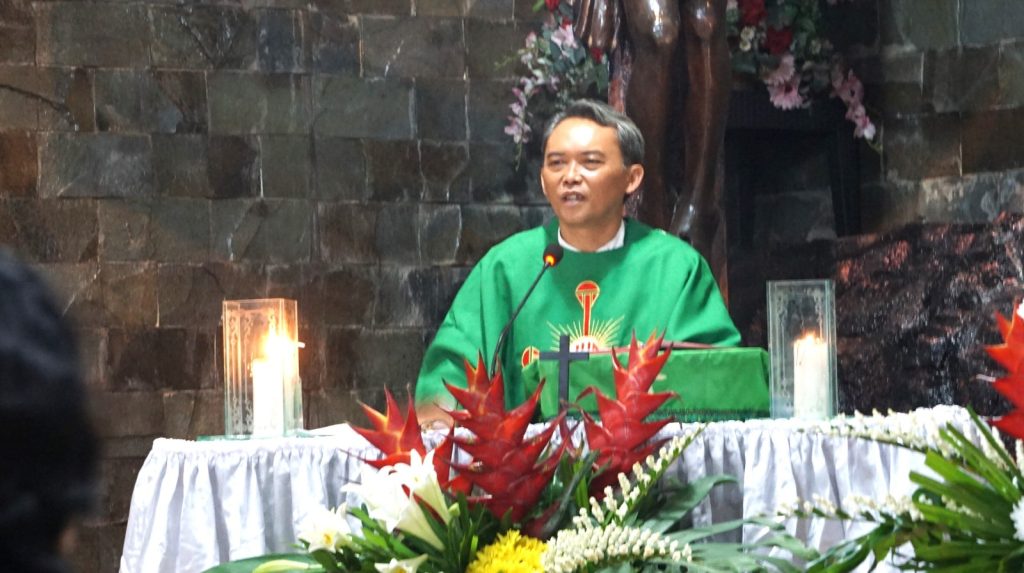 Dari atas panti imam di sebelah gua Maria, Romo Nano MSF mengurai tentang asal muasal penanggal Jawa dan 1 Sura. (dok Elwin)