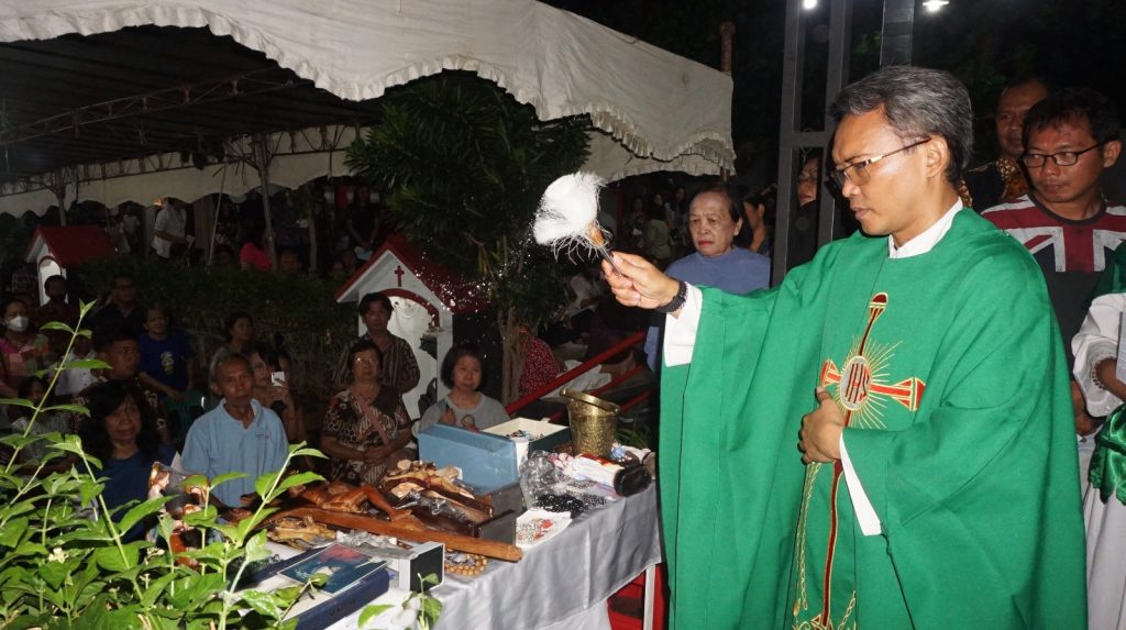 Usai misa, Romo Nano memberkati benda-benda rohani seperti salib, rosario, patung kudus, dll. (dok Elwin)
