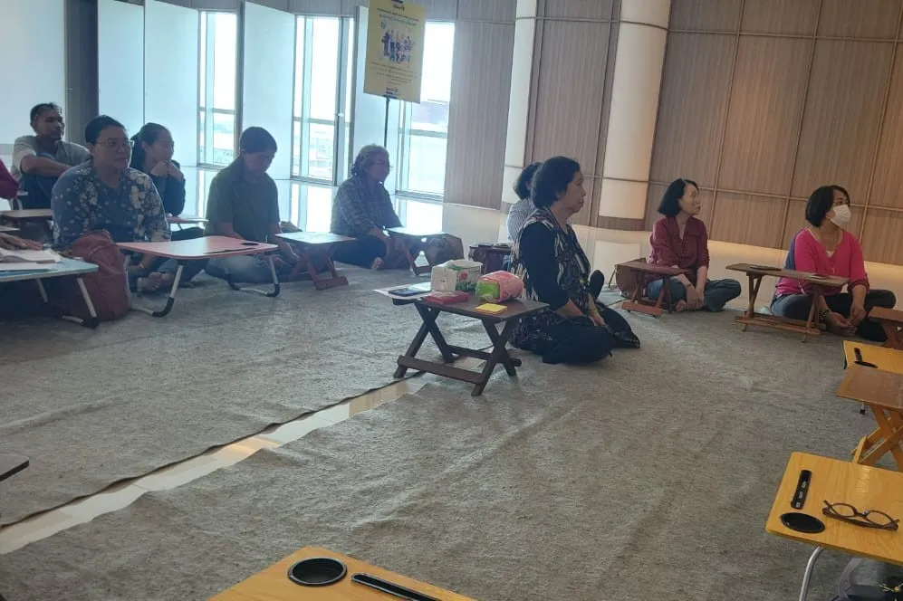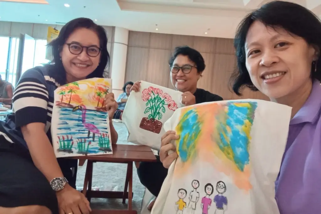 Sejak pukul 09.00 WIB, peserta mengikuti sesi art therapy yang dipandu oleh Endang M.C., M.Psi., Psikolog dan Dra. M. Yang Roswita, M.Si., Psikolog. Melalui media totebag kanvas, cat air, dan kuas yang telah disediakan, para orang tua diajak melukis sebagai sarana menyalurkan emosi, mengurai kepenatan, serta merefleksikan perjalanan pengasuhan mereka. Suasana hangat dan penuh empati terasa sepanjang sesi, terlebih saat para peserta saling berbagi cerita dan pengalaman secara terbuka.