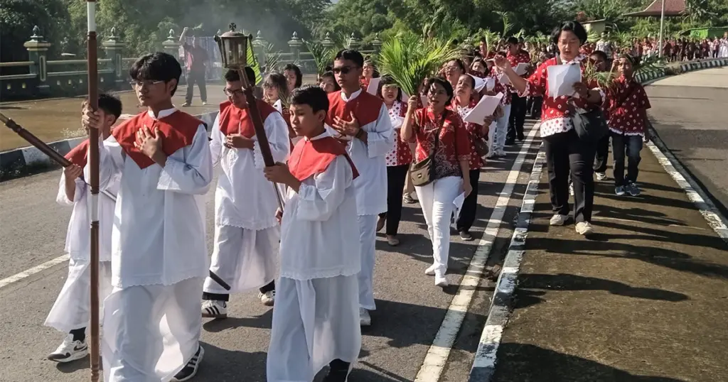 Paroki Macanan – Minggu, 29 Maret 2026, ratusan umat Gereja Santo Yohanes Pembaptis Payak merayakan Minggu Palma. Peringatan yang didahului perarakan dari pendopo kelurahan menuju gereja ini demikian meriah. Umat diajak mengenang kembali saat Yesus memasuki Kota Yerusalem dan disambut warga kota dengan melambai-lambaikan daun palma. Seperti Yesus disambut di Yerusalem, demikian pula umat Gereja Santo Yohanes Pembaptis Payak terlihat antusias mengikuti jalannya perarakan sambil bernyanyi dan melambai-lambaikan daun palma di tangan.