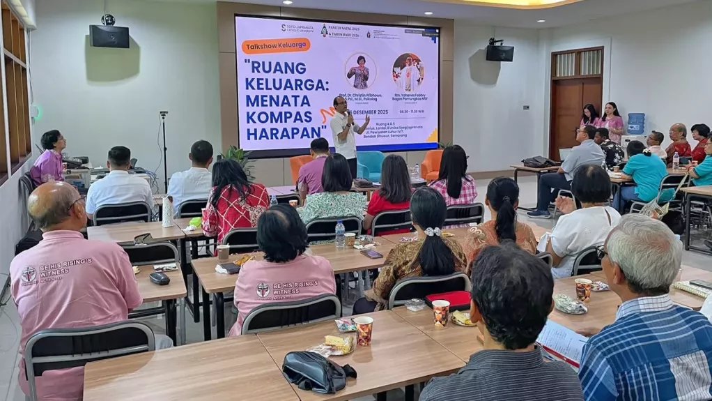Semarang – Soegijapranata Catholic University (SCU) bersama Komisi Keluarga (Komkel) Kevikepan Semarang, Keuskupan Agung Semarang (KAS), mengadakan talkshow “Ruang Keluarga: Menata Kompas Harapan” di Gedung Antonius, Kampus 1 SCU Bendan, Sabtu (6/12/25). Kegiatan hybrid ini digelar untuk membekali keluarga dan Tim Pastoral Keluarga Paroki dalam menghadapi dinamika serta tantangan kehidupan keluarga masa kini.